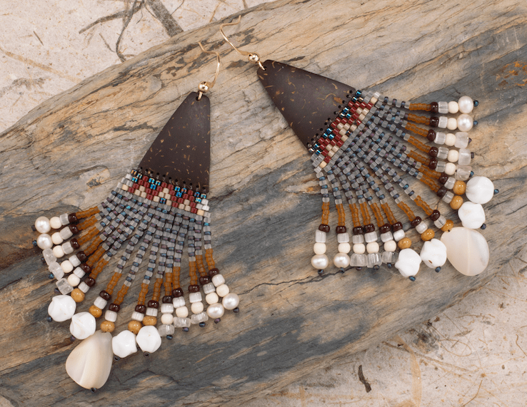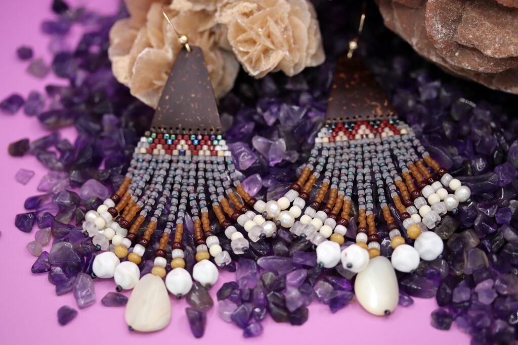 Boucles de caractère toutes en longueur d’inspiration Huichol. Pour celles qui aiment prolonger le mouvement par celui des boucles.